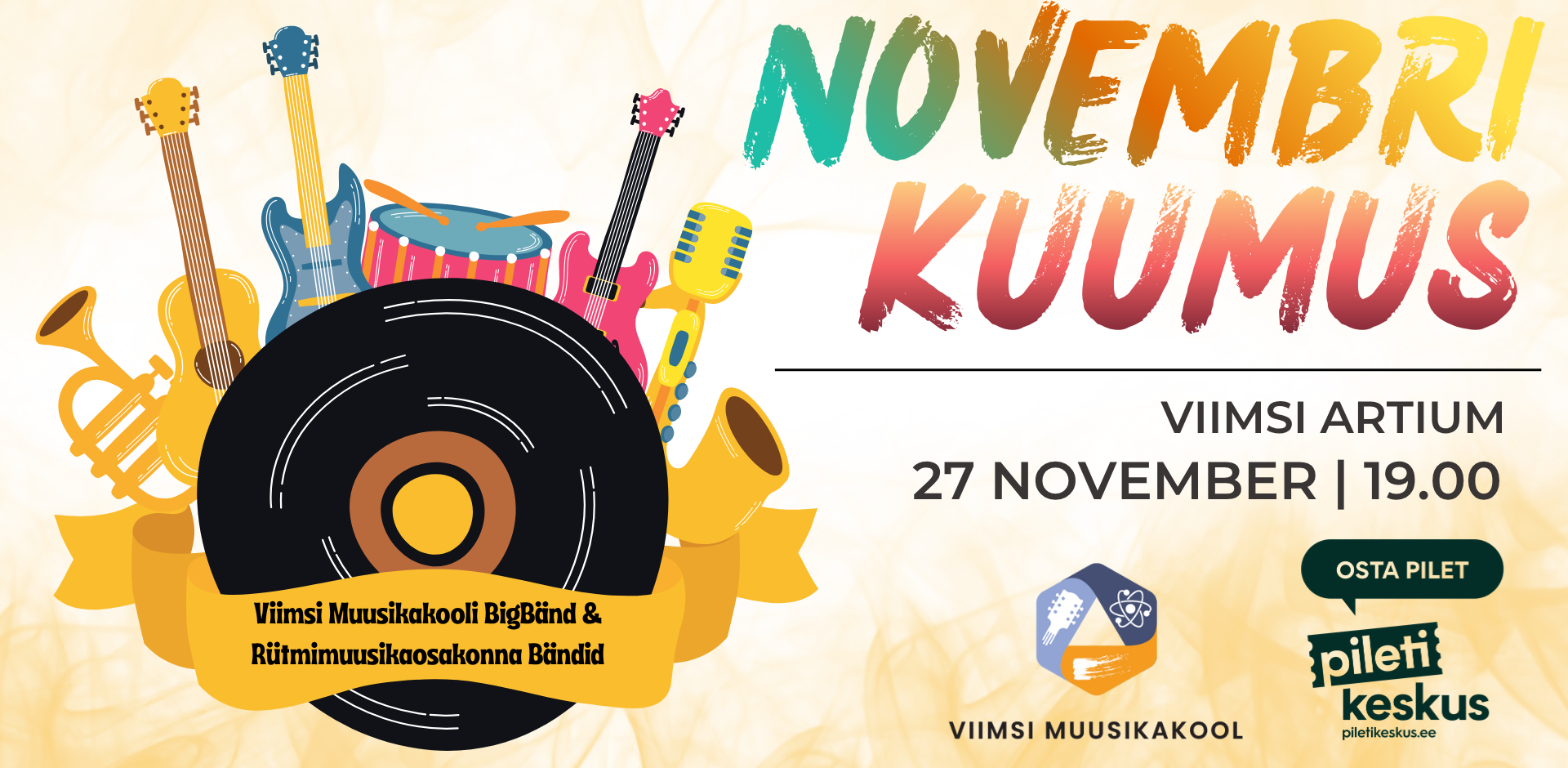 Pimedasse ja vihmasesse sĂĽgisesse saabub NOVEMBRI KUUMUS – Viimsi Muusikakooli traditsiooniline kontsert, kus lavale astuvad kooli BigBänd ja RĂĽtmimuuskaosakonna bändid. See on õhtu, kus kohtuvad nooruslik energia, ehtne lavaelu ja muusikaarmastus, mis paneb sĂĽdame kiiremini põksuma. Kavas on muusikat nii Eestist kui kaugemalt: legendaarsetest klassikutest tänapäevaste hittideni. Laval kõlavad lood ansablitelt ja artistidelt nagu Fix, Smilers, Traffic, Terminaator, Getter Jaani, Sting, Queen, Tina Turner jpt. Lava täitub rĂĽtmidest, mis panevad jala tatsuma ja hinge tantsima – ja kui BigBänd võtab ette lood nagu “Crazy little thing called love” , “September”, siis on raske paigale jääda.